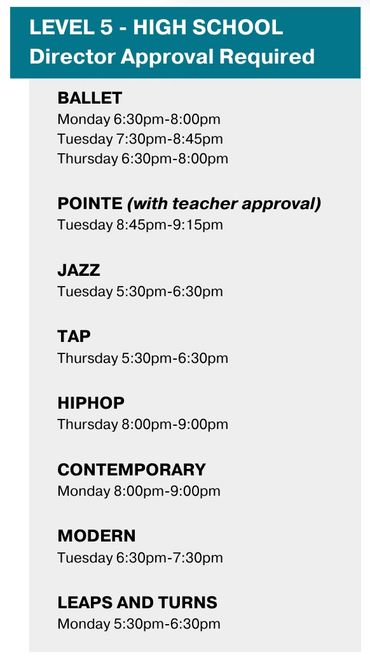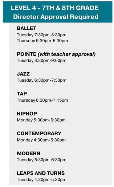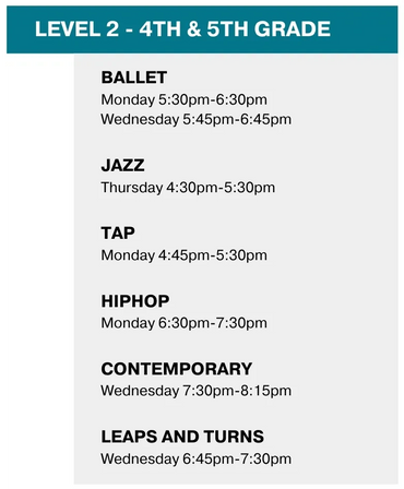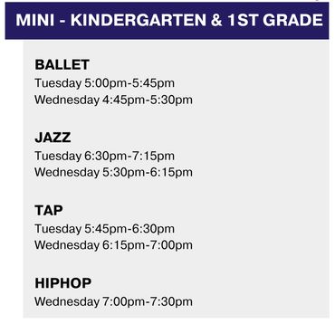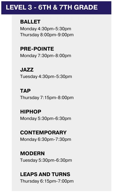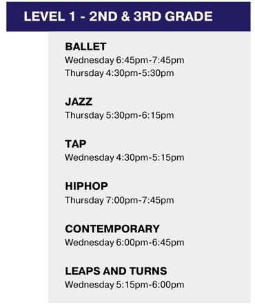 Our class offerings include ballet, jazz, tap, hip hop, contemporary, pointe, turns and progressions and stretch and conditioning.